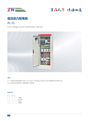低压动力配电柜 XL-21 Low voltage power distribution cabinet 概述 XL-21 型低压动力配电柜适用于发电厂及工矿企业中,在交流电压 500 伏及以下的三相四线系统作动力配电之用。 XL-21 型低压动力配电箱系户内装靠墙安装,屏前检修。 型号含义 X L - 21 □ 方案号 设计序号 动力控 控制箱 13